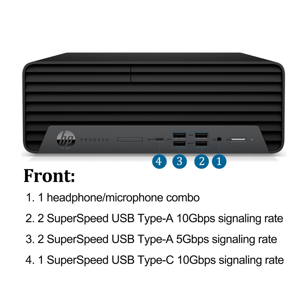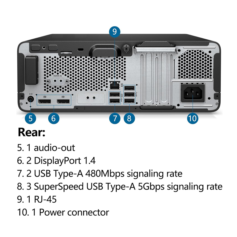 1 audio-out; 1 power connector; 1 RJ-45; 2 DisplayPort 1.4; 3 SuperSpeed USB Type-A 5Gbps signaling rate; 2 USB Type-A 480Mbps signaling rate